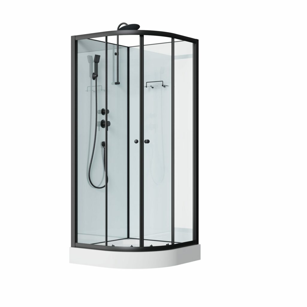 Cabine de douche noire quart de rond 90X90 - REF FRCS07-900• Dimensions: 90X90X215 CM • Avec douche de tête, douchette à main, flexible de douche et mitigeur mécanique